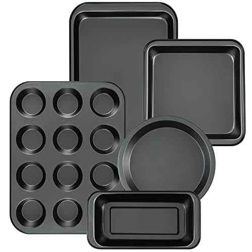 Complete 5-Piece Bakeware Set: Including a round cake pan, a square cake pan, a loaf pan, a cup muffin pan, a deep roast pan. All pieces of our baking set were designed to fit neatly into one another, saving you valuable space in your kitchen cabinets. The nonstick baking pans set will fit into regular kitchen cabinets or under standard kitchen ovens.