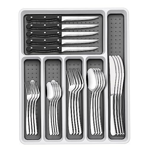 SILVERWARE SET FOR 8: This 49PCS flatware set with silverware organizer includes 8 each of Dinner Spoon, Teaspoon, Dinner Fork, Dessert Fork, Dinner Knife, and Steak Knife. It also comes with 1 plastic non-slip cutlery organizer for tidy storage.