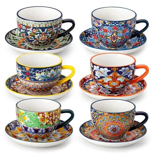 The Vancasso 8 oz cappuccino cups are a delightful addition to any coffee lover's collection. This 6-piece set includes beautifully designed cups and matching saucers, perfect for serving lattes, cappuccinos, or tea. The vibrant bohemian patterns add artistic flair, making your coffee time feel unique and cheerful. Crafted from premium lead-free ceramic, these cups are both microwave and dishwasher safe, ensuring convenience in everyday use. The smooth glazed surface resists stains, making them easy to clean. They make a thoughtful gift for special occasions such as weddings, birthdays, or housewarmings, combining functionality and style. Enjoy your favorite beverages in these charming mugs!